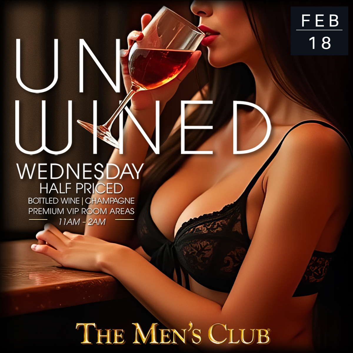 Unwined Wednesdays at The Men’s Club redefine the midweek unwind. From 11AM to 2AM, step into a world of refined elegance, where rich ambiance and upscale service create the perfect atmosphere for relaxation and connection. Enjoy half-priced bottles of wine and champagne as you unwind in our exclusive premium VIP room areas, designed for comfort and style. Elevate your Wednesday with great company, smooth pours, and unbeatable value — only at The Men’s Club.